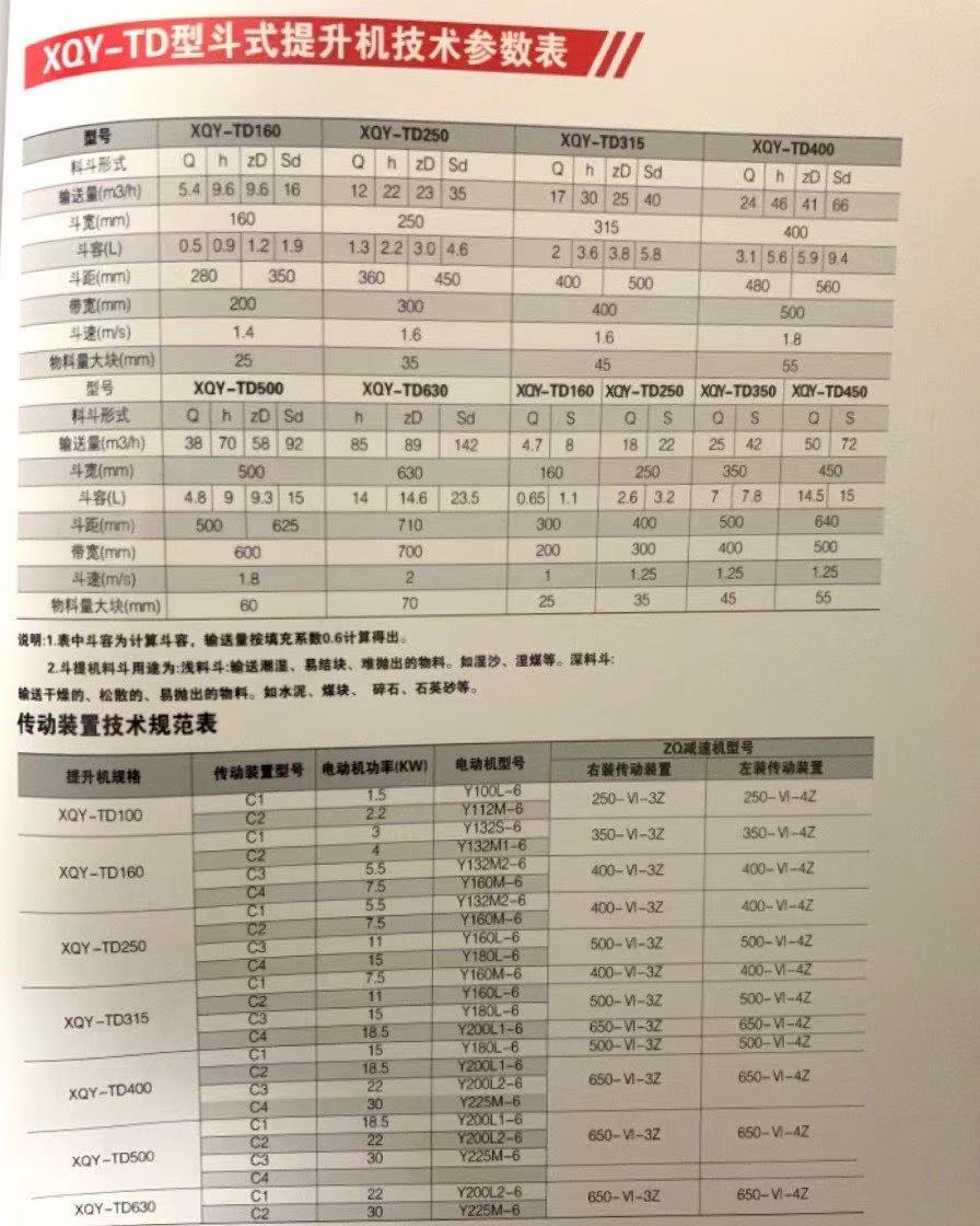 XQY-TD型斗式提升机适用于垂直输送堆积密度不大于1.5t/㎡的粉状、粒状、及小块状的磨琢性较小的散状物 料,如粮食、煤、水泥、碎矿石等,提升高度最高4Cm.TD系列斗式提升机严格按照JB3926-85《垂直斗式提升机》 标准设计制造,目前国内常用的斗式提升机均为垂直式。TD系列斗式提升机特点为:结构简单,运行平稳,挖取式装 料,离心重力式卸料,物料温度不超过60℃;TD系列斗式提升机与传统D型斗式提升机相比输送效率高、料斗形式多, 应优先选用。本机备有四种料斗:C型(浅斗)、H型(弧底斗)、zh型(中深斗)、sh型(深斗),分别输送各种物料,用户可以根据物料特性来选择适当的料斗。本提升机代号为TD,即带式三式提升机;产品规格以斗宽表示。