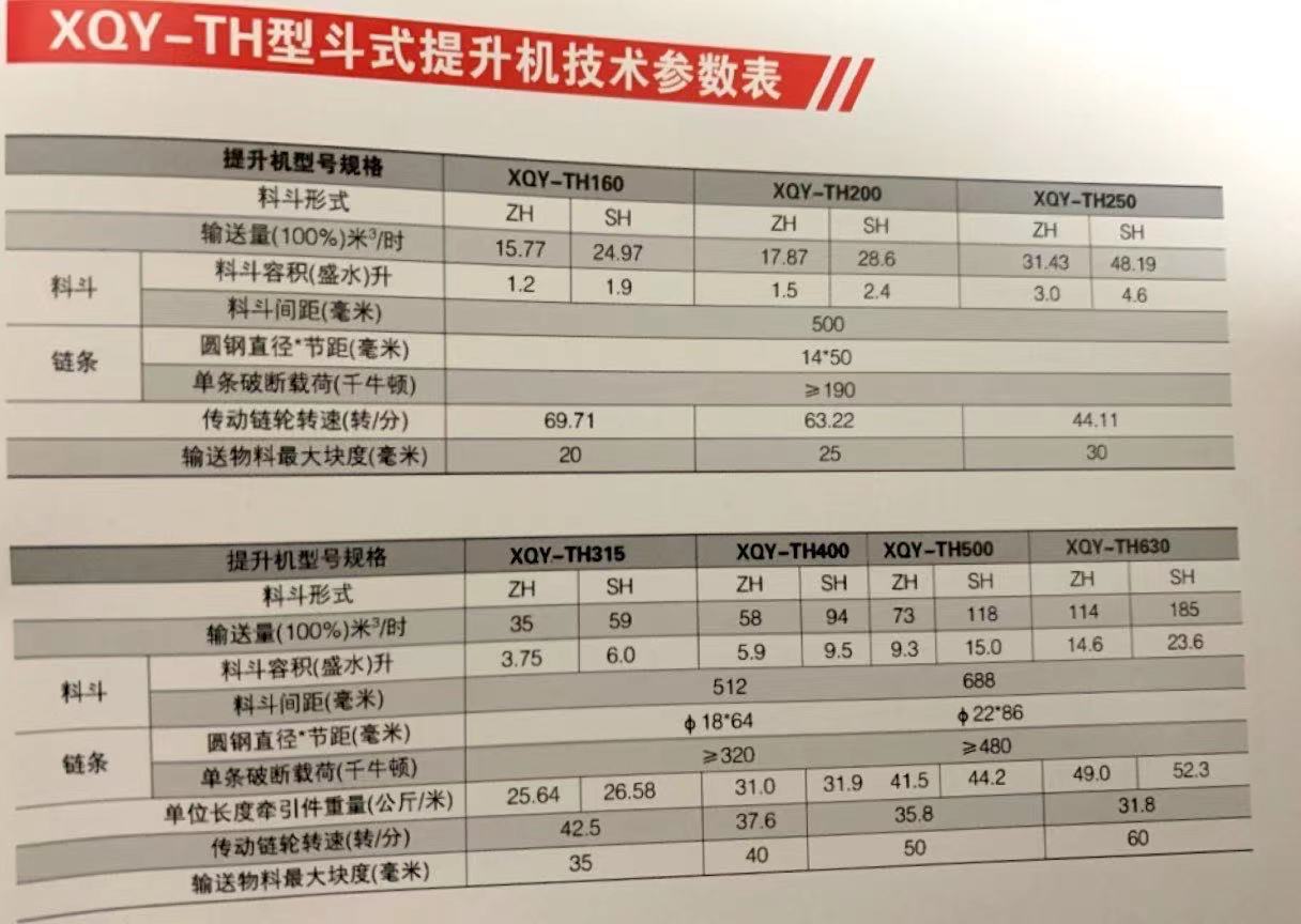 二、XQY-TH型斗式提升机主要特点 1.维护方便,寿命长。 2.机壳钢板加厚、刚性好。 3.输送物料的温度最高可达250C. 4.中节机壳具有单通道和双通道两种形式。 5.提升高度运行平稳可靠,噪音小,维护方便。 6.改进机型的提升输送量比普通机型提高30%以上。 7.提升机环链采用低合金钢锻造,并经渗碳淬火处理,具有极高的抗拉强度和耐磨性能。 注释: 1.表中斗容为计算斗容,输送量按填充系数0.6计算得出。 2.ZC-TH型斗式提升机料斗用途: Zh--中深斗输送湿粘性物料,如糖、湿细沙等。 Sh--深斗:输送重的粉状至小块状物料如水泥、砂、煤等。 3.HL型斗提机料斗用途: Q--浅园底料斗:输送潮湿、易结块、难抛出的物料如湿沙、湿煤等。 S--深园底料斗:输送干燥的、松散的、易抛出的物料,如水泥、煤块、碎石等。 4.张紧力计算: G=40+0.232H 式中:Q--输送量(th)H--提升高度(mm)G--张紧力(kg)